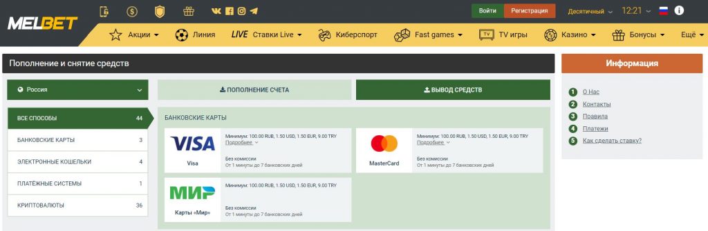 Для того, чтобы осуществить вывод денежных средств необходимо зарегистрироваться на сайте БК Мелбет. В личном кабинете зайти в раздел вывод средств. Выбрать способ вывода, после чего ввести сумму транзакции и подтвердить операцию.